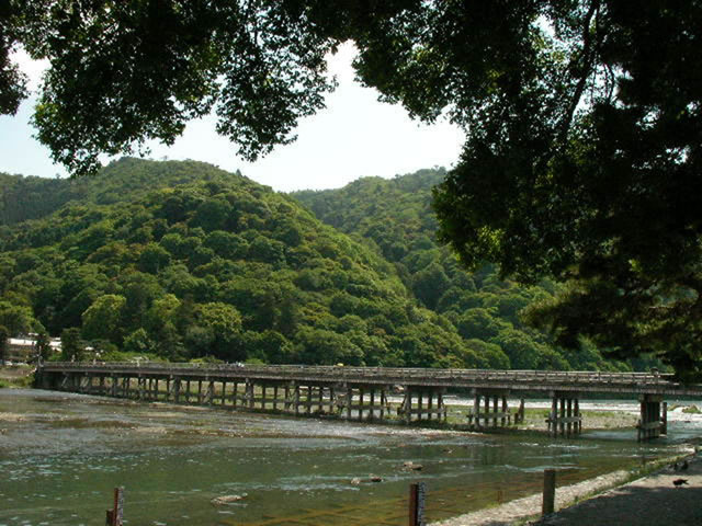 大阪から友人が車で京都案内をかって出てくれた。 アッシー君があれば、と、嵐山にまず直行。 北斎の浮世絵でも有名な渡月橋。(とげつきょう) 木製のこの橋を境に,保津川から桂川に名前が変わる。 秋の紅葉の頃も、いかに美しいだろうと想像できる眺め。 橋の上から大きな魚が沢山見えた。 川の上に糸を張り巡らせているのは 釣りを出来なくする為だそうだ。